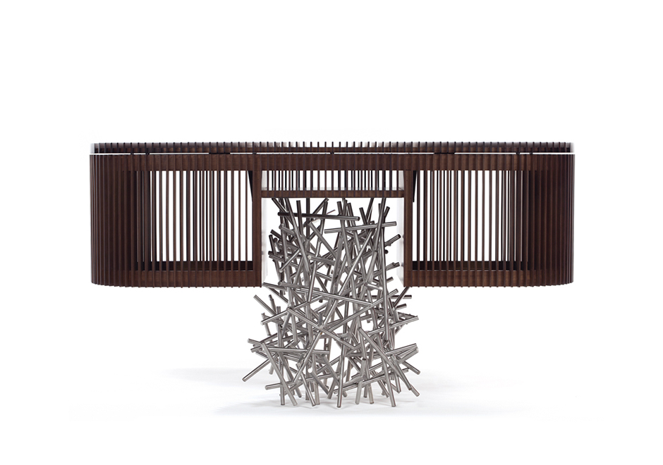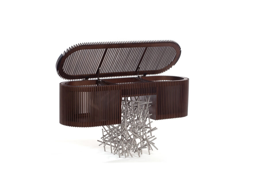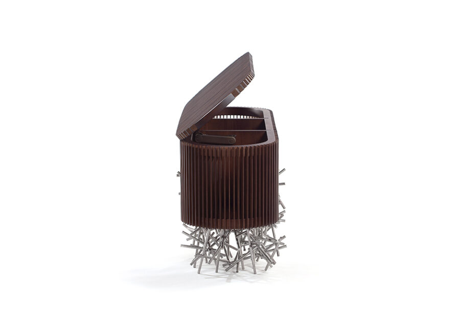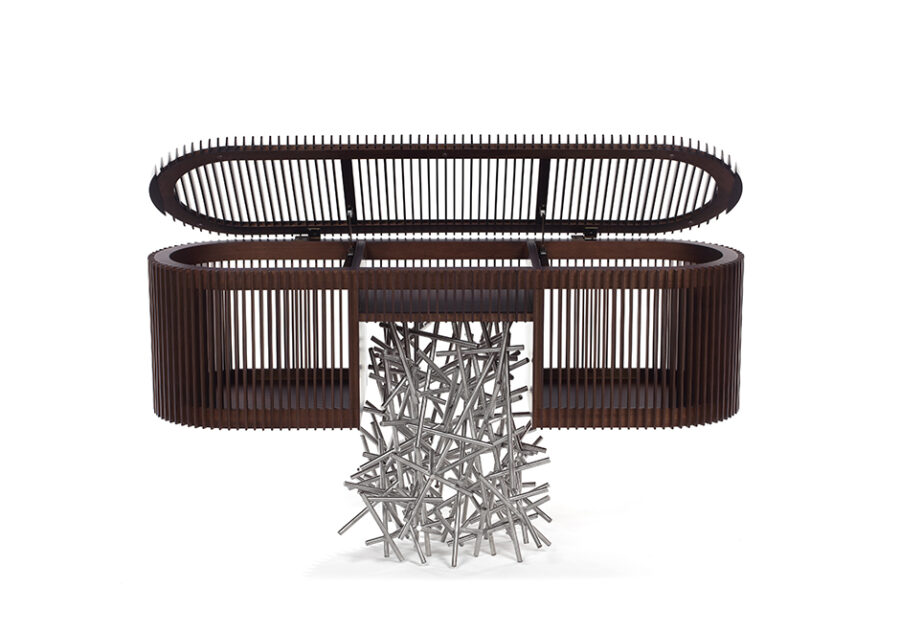 Os pés em aço inoxidável do buffet Ripas Inox remetem à infância dos designers Fernando e Humberto Campana, quando se divertiam fazendo os próprios brinquedos. Nesta peça, que possui tampo basculante, o aço trabalhado contrasta com a madeira ripada. O resultado é uma peça icônica, capaz de sobressair em qualquer espaço e estilo de decoração. Edição limitada de dez peças.