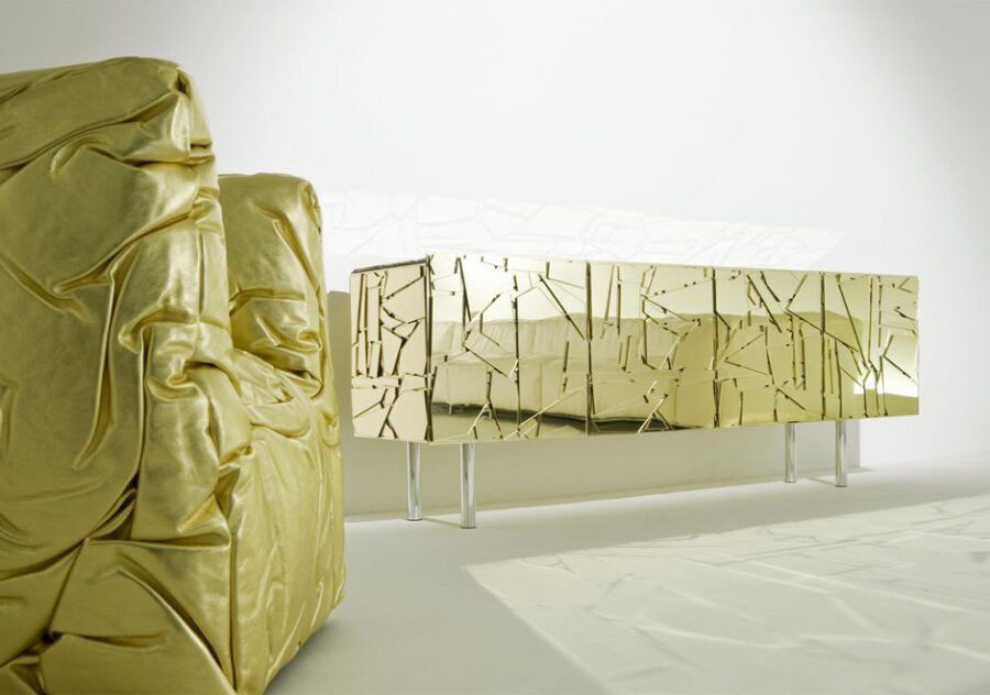 Com a assinatura de Fernando e Humberto Campana, o aparador Scrigno é uma criação exclusiva para a italiana Edra e sobressai no ambiente pela união perfeita entre um design requintando e materiais inusitados. A estrutura de madeira da peça foi revestida com fragmentos de Colorflex (acrílico espelhado), criando um efeito ousado e vibrante.