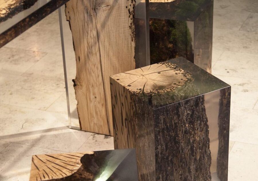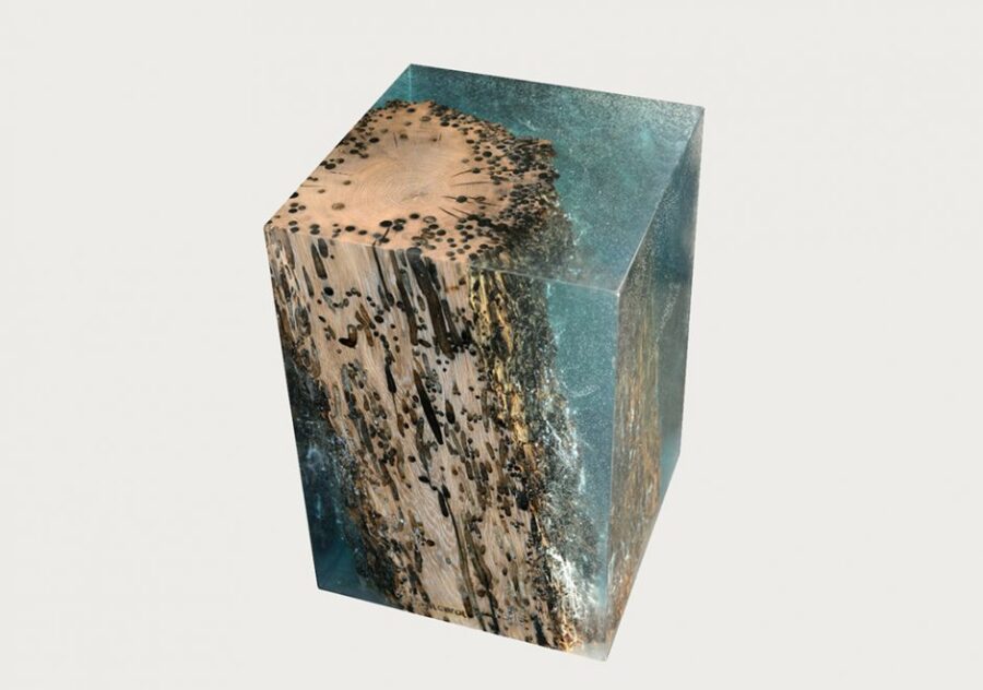 Madeira coberta por resina incolor ou azul.