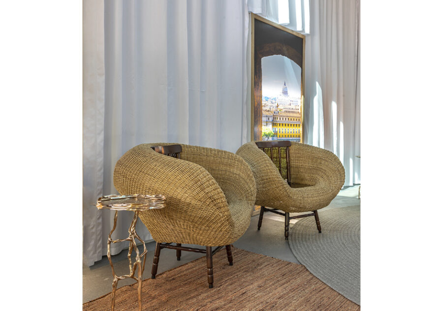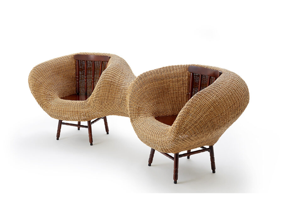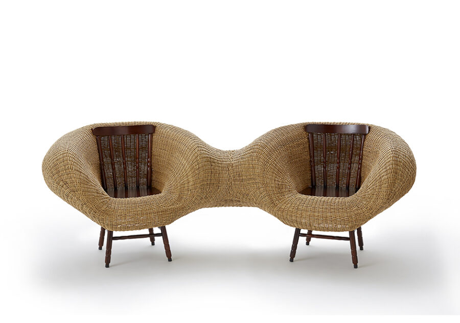 Dois Irmãos é um banco de estrutura de arame coberto de vime tramado que une duas cadeiras de madeira, em uma releitura de materiais tradicionalmente usados pelo Estudio Campana. Com técnicas manuais genuinamente brasileiras, o resultado é uma peça que visualmente evoca a união, a parceria e a cumplicidade, representando os valores dos designers. Edição limitada de 35 peças.