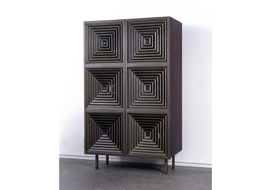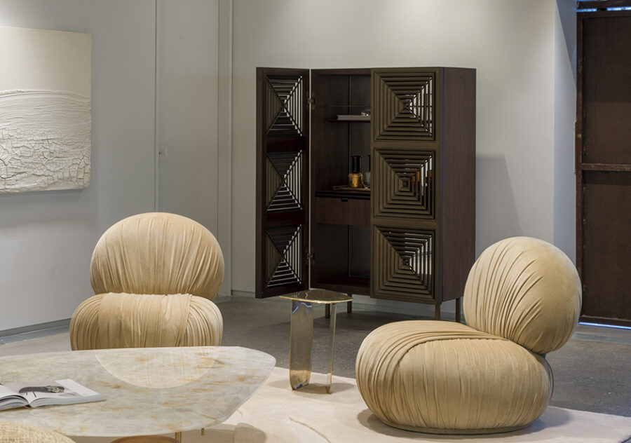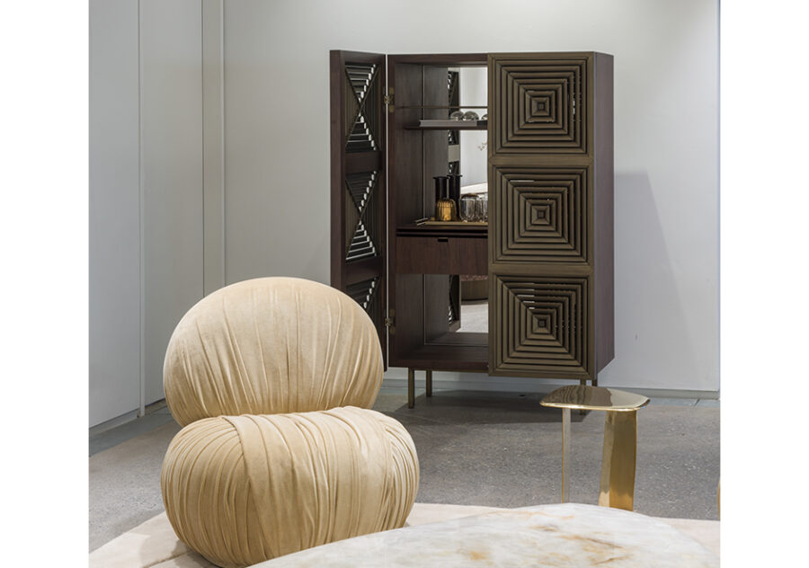 O bar AC, criado pelo escritório paulistano Suite Arquitetos, é todo revestido em folha de madeira natural de nogueira, exceto as portas que são em alumínio pintadas na cor latão, e os pés em aço carbono também pintados na cor latão. Na parte interna, o fundo é de espelho de cristal, tem duas gavetas, uma prateleira e detalhes de latão escovado. O revestimento em MDF tem várias opções em folha de madeira natural: Nogueira, Imbuia, Freijó, Carvalho ou Pau Ferro. A base em tubo metálico de aço carbono tem acabamento em latão, níquel, dourado, corten, preto ou fendi.