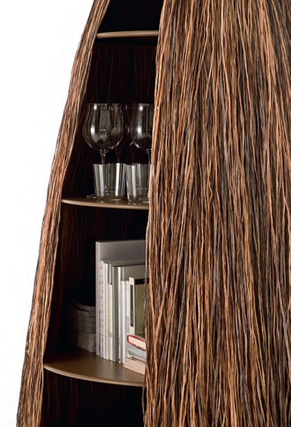 Assinado por Fernando e Humberto Campana para a marca Edra, o armário Cabana é feito com estrutura e cinco prateleiras de metal laqueado na cor marrom, revestida por fios de ráfia sintética antifogo. Abertura da ráfia em 180°.