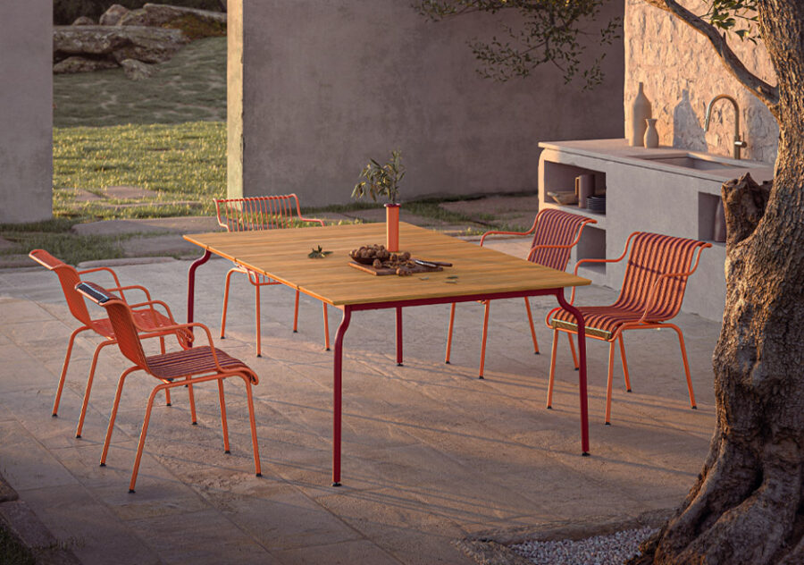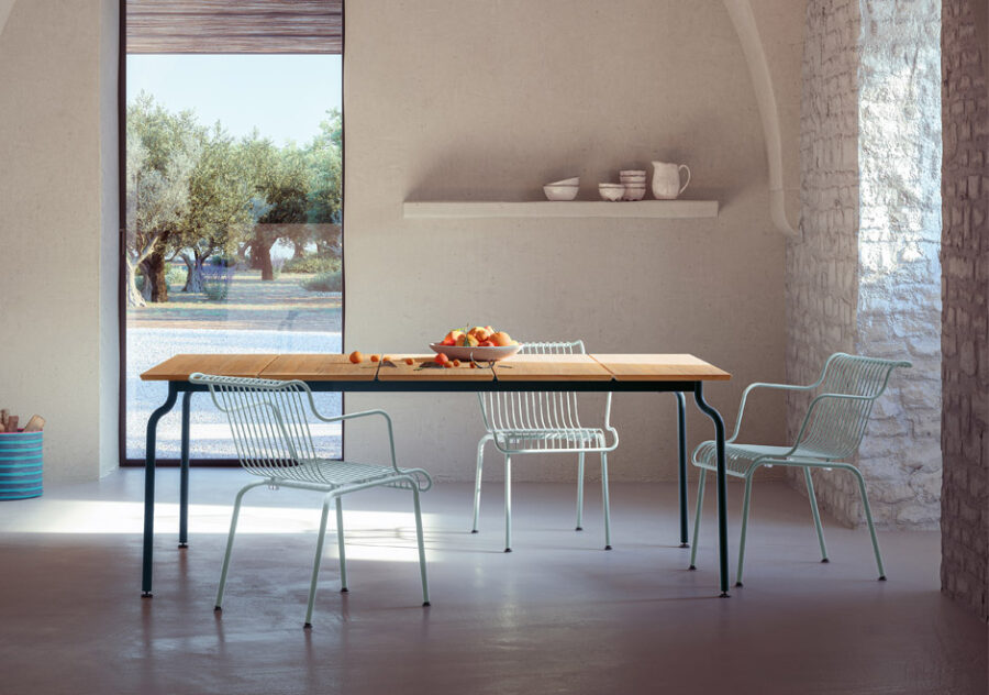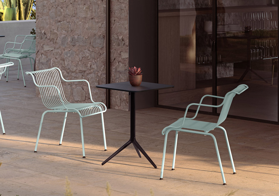 A cadeira de jantar South, do alemão Konstantin Grcic para a Magis Design, nos convida a reunir amigos para confraternizar ao ar livre com conforto e estilo. O contorno curvo dos assentos em tela de arame é a característica mais marcante da coleção South, que tem na cadeira um grande exemplo. As curvas suaves nas bordas dos assentos permitem momentos de relaxamento, que são favorecidos pela estrutura tubular com dois apoios de braços suavemente curvados.