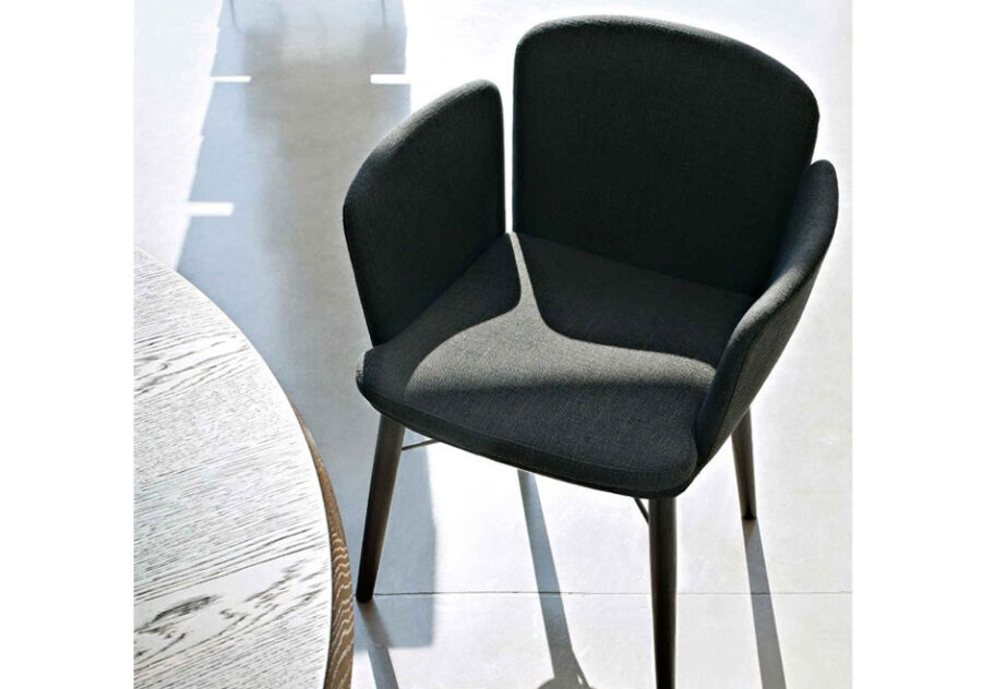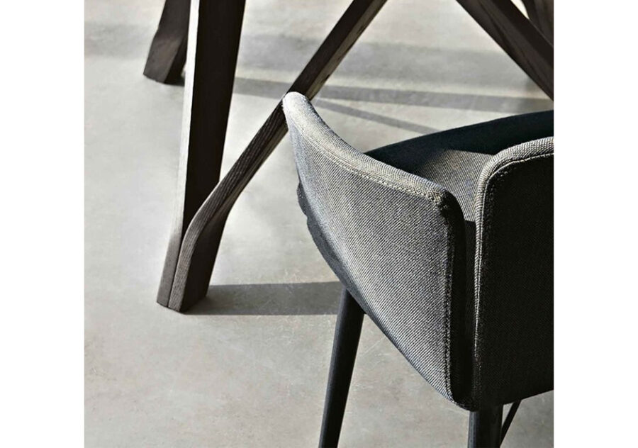 A cadeira Tabby tem estrutura de madeira preta ou marrom e é estofada em tecido ou couro conforme necessidades e preferências.