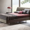 Dream View, cama criada por Roberto Lazzeroni para a marca Lema, tem pés de metal pintado em preto e estrado de madeira. A cabeceira e o estrado são estofados com capas removíveis de tecido ou couro, em variadas opções.