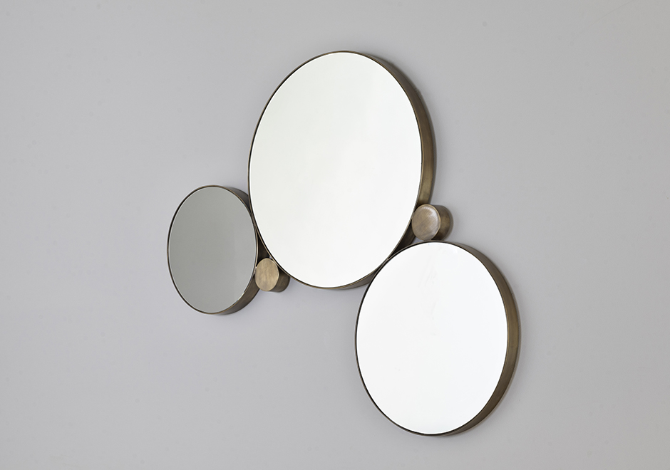 O espelho Espuma em estrutura em latão envelhecido com três espelhos ou vidros nas cores prata, fumê e/ou bronze.