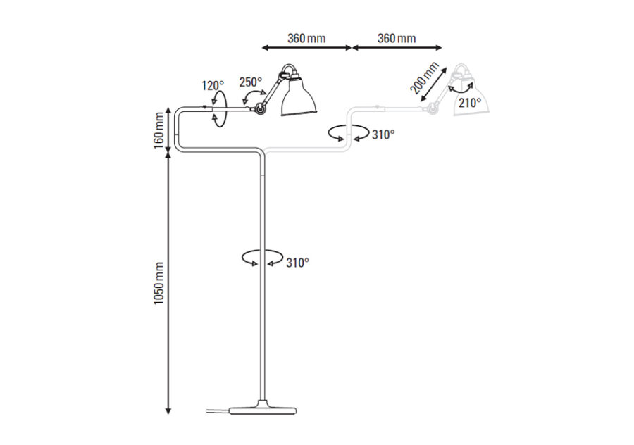 A luminária de chão Gras N°411 é fabricada em aço, com acabamentos disponíveis em preto, branco, cobre, latão, cromado e combinações como cobre bruto e cobre com branco.