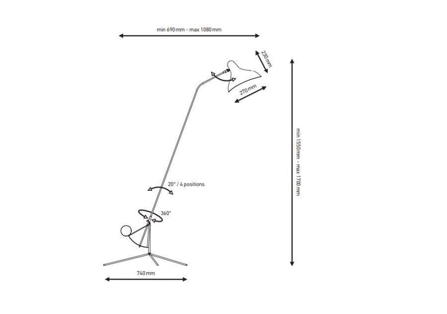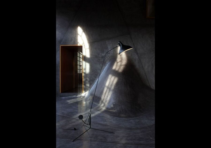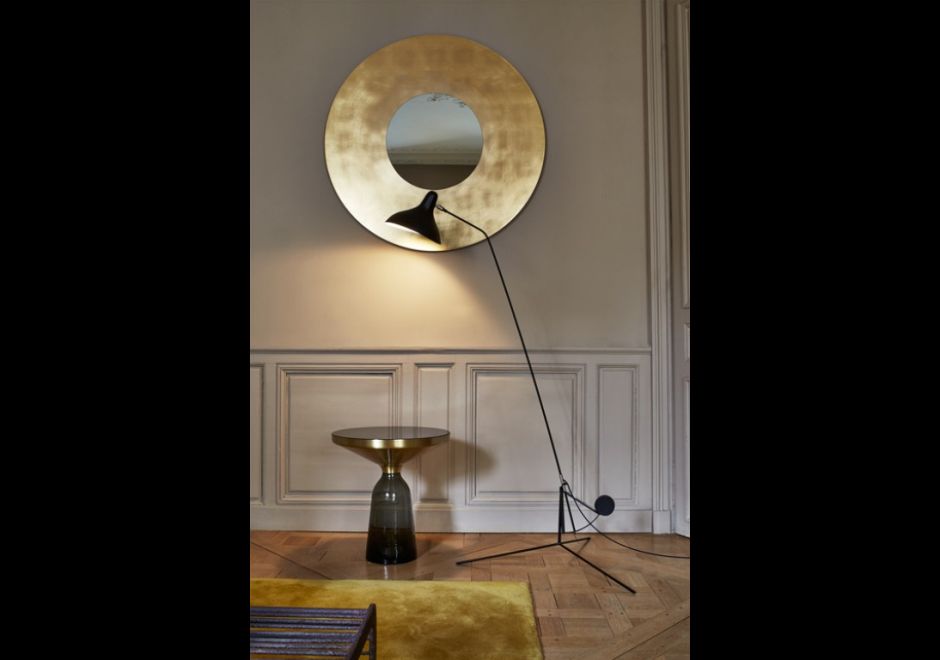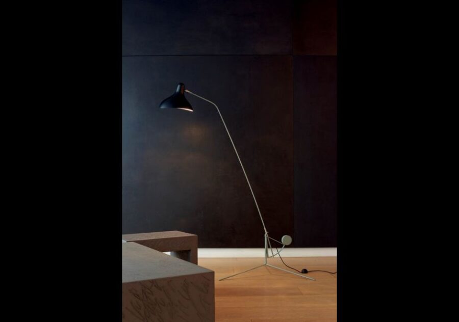 A luminária de chão Mantis BS1, por Bernard Schottlander para a marca DCW Éditions, é feita com tripé de aço niquelado ou pintado de preto.