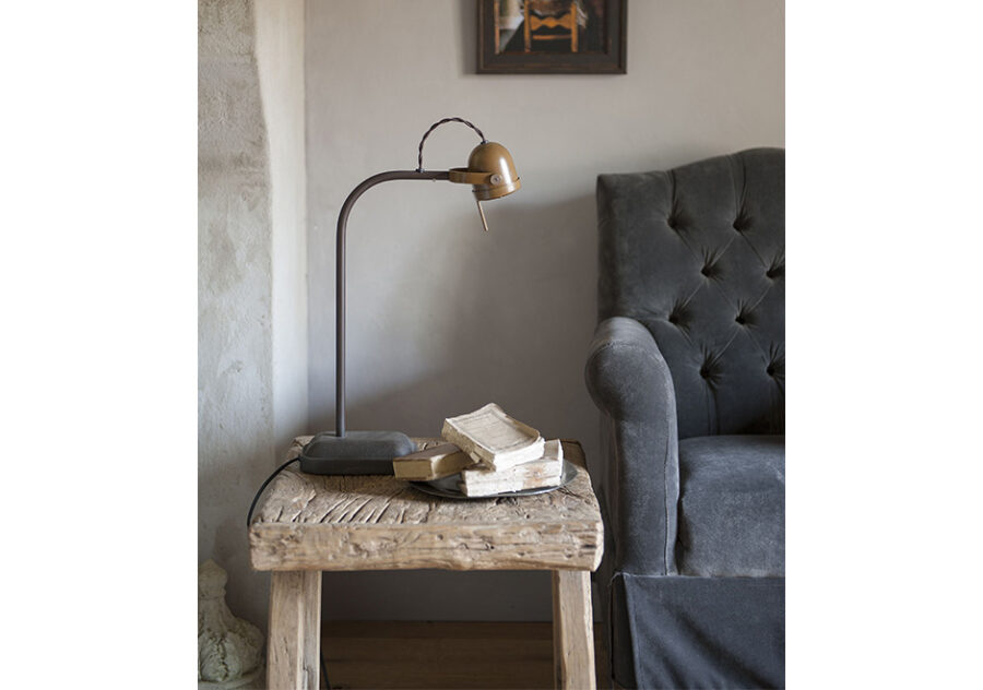 Luminária de mesa Spezia, da marca holandesa Frezoli, com estrutura de aço com acabamento e cúpula de cobre ou acabamento cinza escuro fosco e cúpula cinza escura. LED.