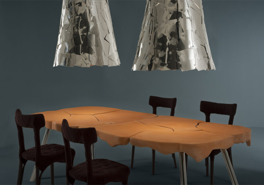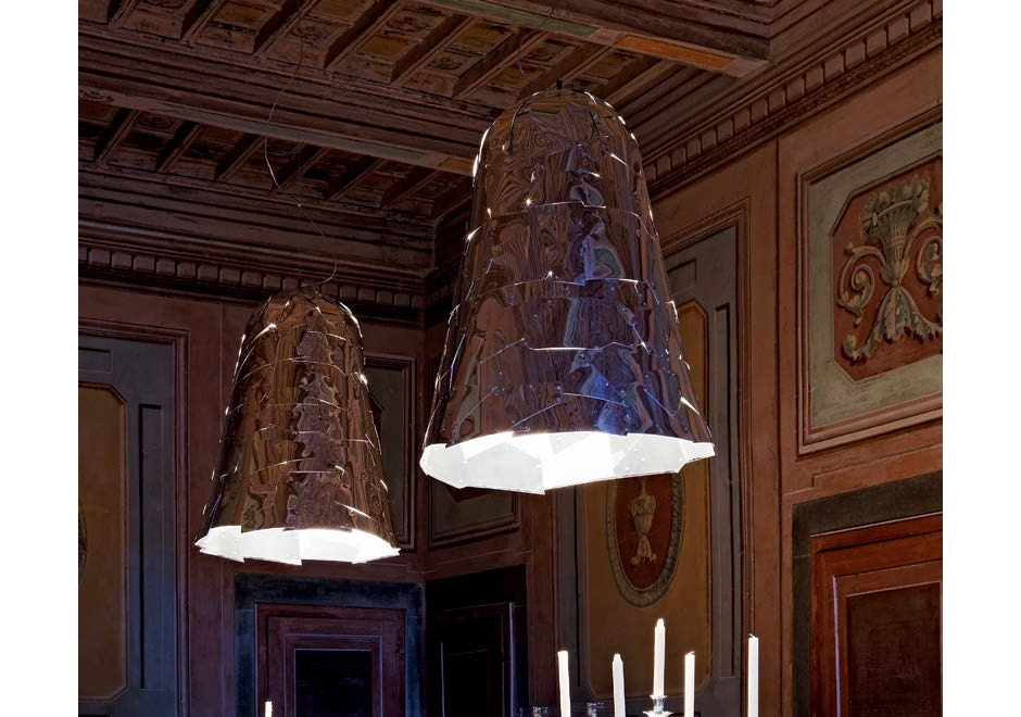 O esplêndido trabalho manual em sintonia com o design irreverente é marca registrada de Fernando e Humberto Campana. A magnífica luminária de teto Campana, feita exclusivamente para a marca italiana Edra, reflete o talento da dupla. A peça, que funciona de forma admirável como objeto decorativo, é composta por folhas de alumínio polido dourado ou prateado, cortadas a laser e montadas à mão. Cada peça é única. Disponível em dois tamanhos.