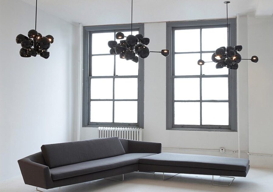 Feita sob medida para promover uma amplitude generosa de luz, a luminária de teto Kopra Burst, da marca David Weeks Studio, é montada em uma coluna central de aço e 15 cúpulas de alumínio em tamanhos variados. Cada cúpula é capaz de girar 320 graus, o que possibilita diferentes padrões de iluminação.