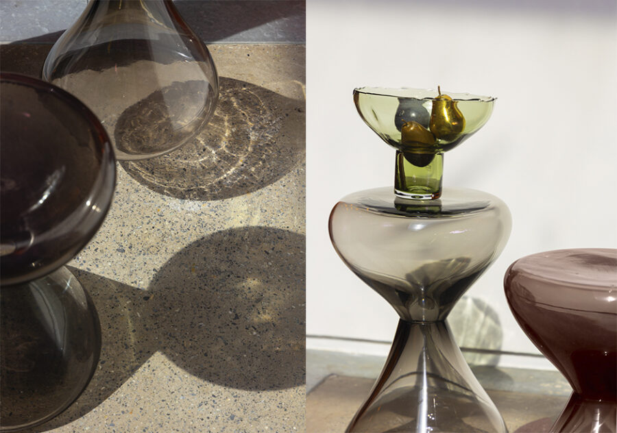 Psilo nomeia um jardim de cogumelos de vidro, onde mesas feitas em vidro soprado se apresentam em formatos que se relacionam com as formas encontradas na natureza. As cores aparecem em nuances criadas pela própria matéria prima soprada. A coleção é composta de peças únicas, produzidas uma a uma manualmente.