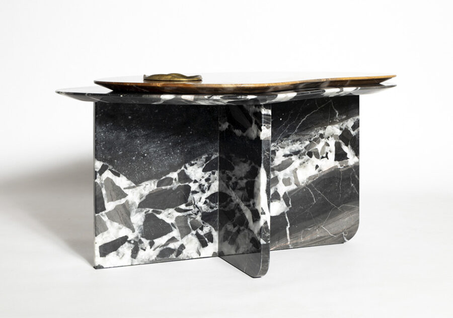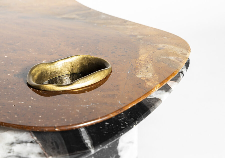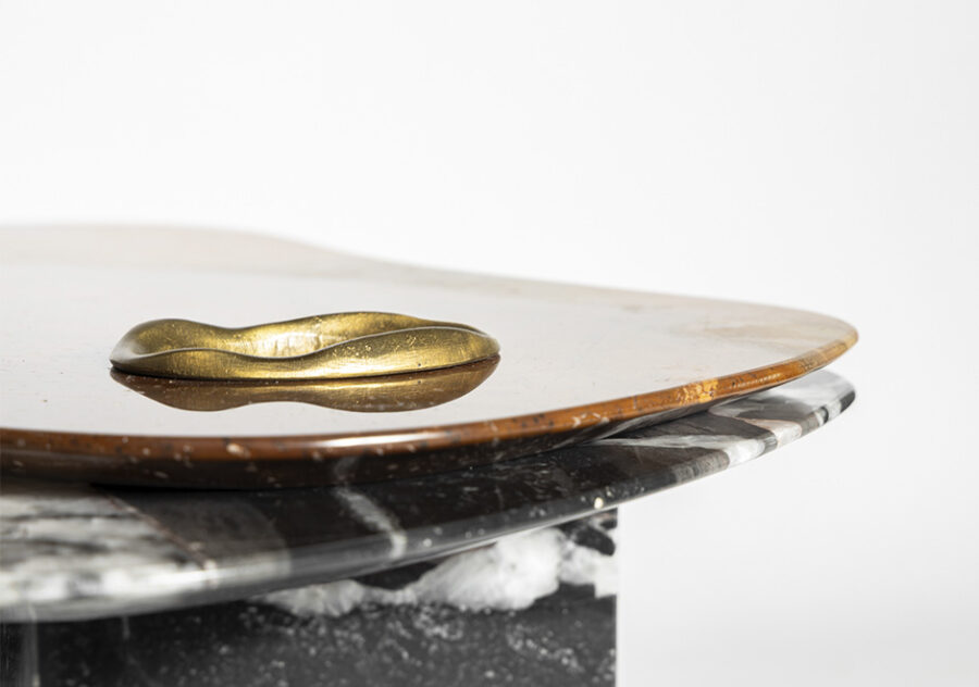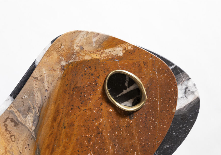 Anel orgânico fundido em latão encaixado no tampo superior evidenciando a pedra do tampo inferior. Opção do tampo inferior e pé em quartzito Bronzite com tampo superior em quartzito Black Patagônia ou vice-versa.