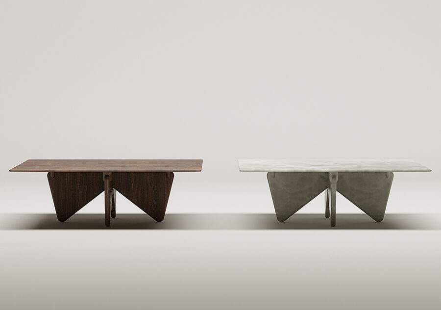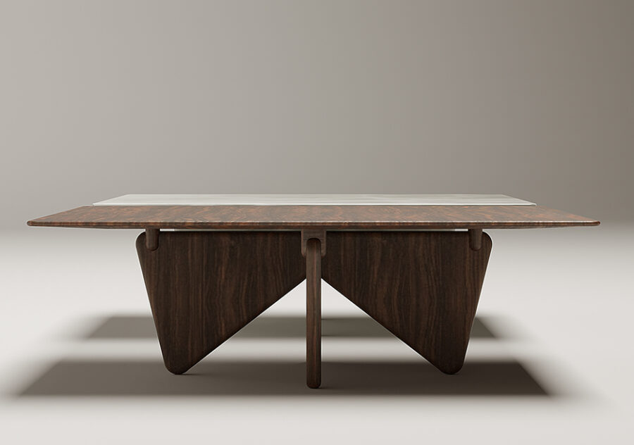Dentre as obras modernistas que inspiraram o arquiteto estão as bandeiras dos quadros de Alfredo Volpi e os mobiliários do italiano Carlo Hauner e do francês Jean Prouvé. A mesa de centro Lupi Vintage esbanja elegância e dinamismo no uso de pedras e lâminas naturais de madeira como matéria-prima. Cada parte que compõe o móvel é conectada por encaixes e apoios.