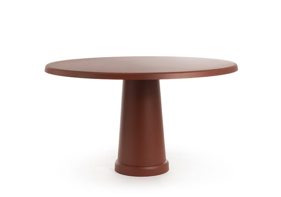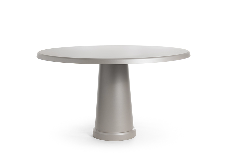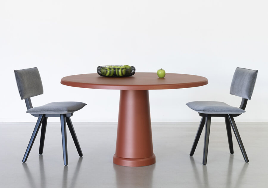Mesa com base e tampo em chapa de aço (espessura 36 mm) pintada com pó de poliéster nas cores cinza, bronze ou marrom. Opção do tampo em MDF revestido com folheado de carvalho na cor natural (espessura 26 mm).