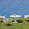 Disponível em dois tamanhos, a mesa de jantar Brasília tem pés em alumínio polido e tampo com placas de metacrilato Colorflex (acrílico espelhado) cortados a laser e em várias tonalidades.