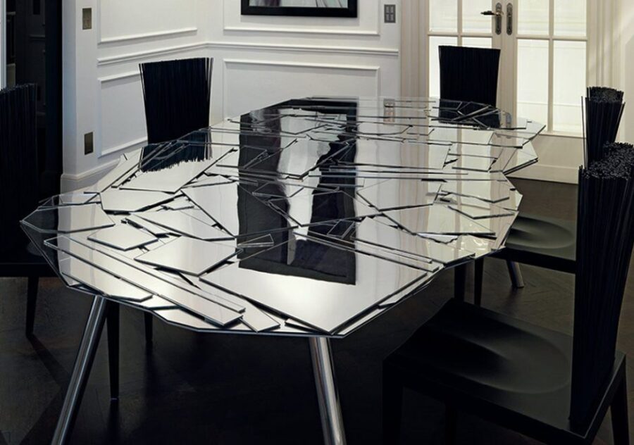 Disponível em dois tamanhos, a mesa de jantar Brasília tem pés em alumínio polido e tampo com placas de metacrilato Colorflex (acrílico espelhado) cortados a laser e em várias tonalidades.