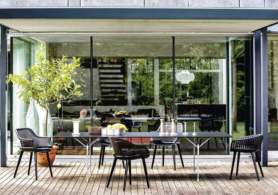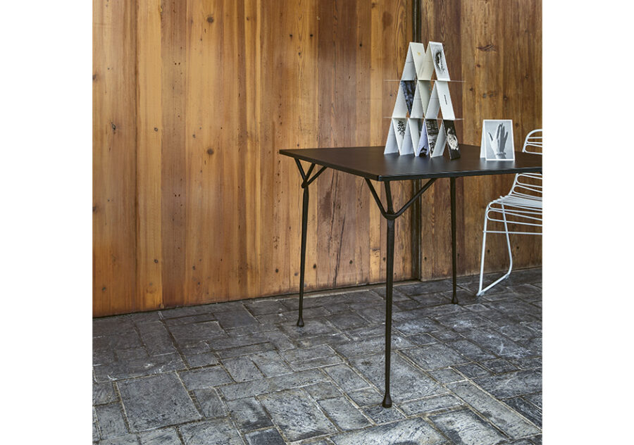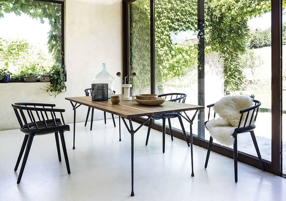 A mesa de jantar Officina, criada por Ronan & Erwan Bouroullec para a marca Magis, valoriza diferentes materiais e formas. Sua estrutura em ferro forjado, galvanizado ou pintado, ganha destaque em meio a uma linguagem única de curvas e pontos. As opções de tampos variam desde metal, mármore, vidro e madeira.