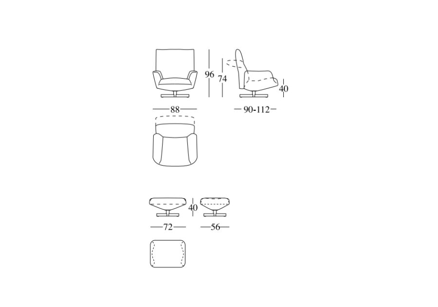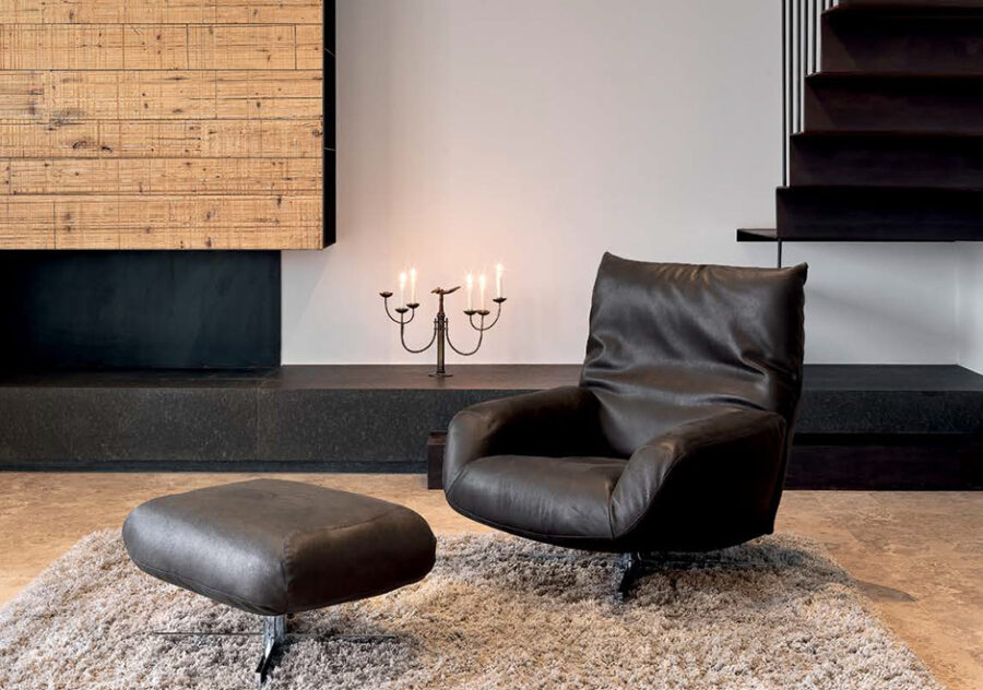 A poltrona Chiara tem base de aço cromado polido, estrutura de metal revestida com espuma de poliuretano flexível Gellyfoam® e estofado em tecido ou couro. O móvel pode ter a companhia de um pufe para proporcionar ainda mais conforto.