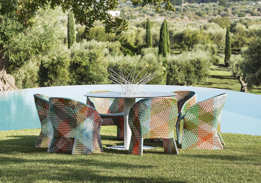 A poltrona outdoor Maat, com estrutura de alumínio e fibras sintéticas trançadas e coloridas, é um convite a desfrutar momentos de relax ao ar livre. Assinada pelo designer Philippe Bestenheider para a marca Varaschin, a peça transborda conforto, jovialidade e beleza e está disponível em duas padronagens e duas opções de tamanho.