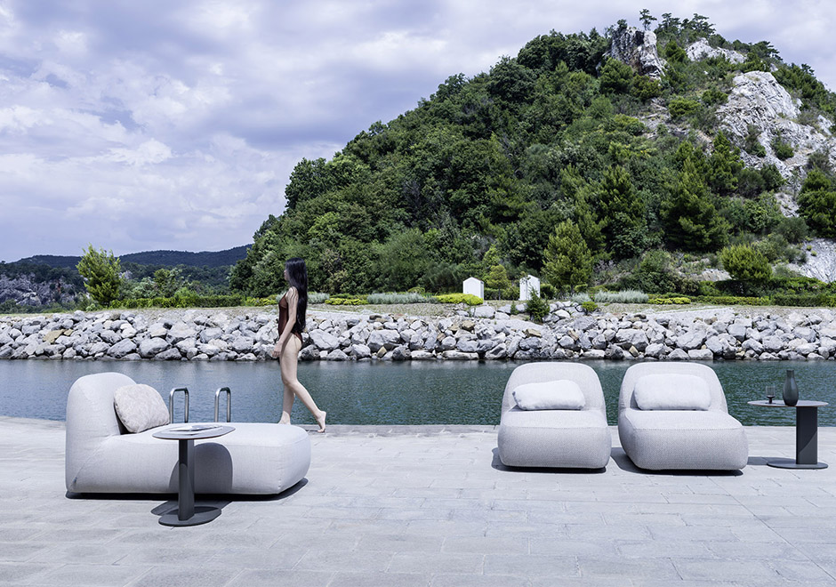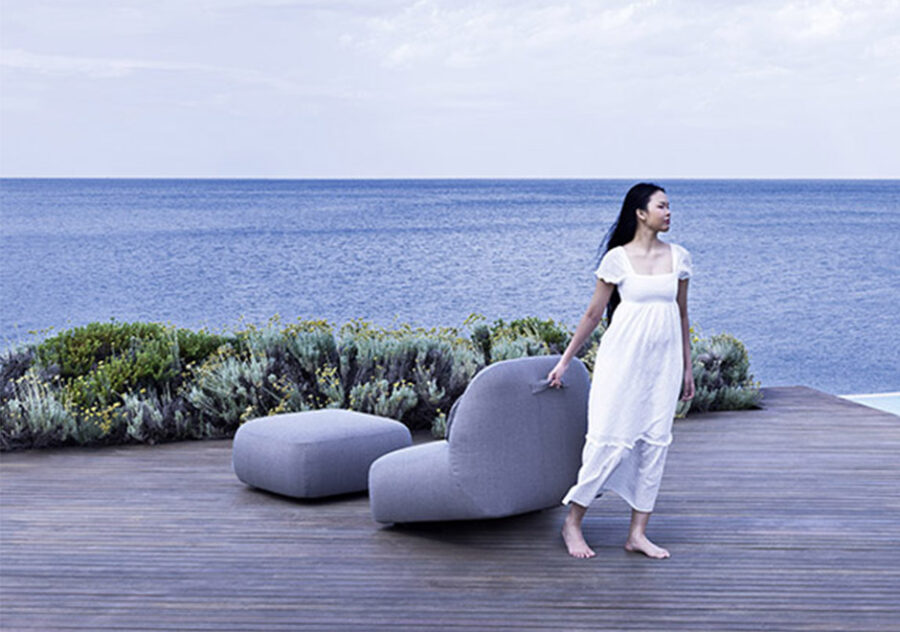 Desenhada pelo estúdio italiano Calvi Brambilla para a Varaschin, a poltrona Reuse tem estrutura em madeira maciça de okumé, espécie africana leve e resistente à umidade, ideal para uso externo. As almofadas são produzidas em espuma Dryfeel® e revestidas em tecido de cânhamo, com materiais recicláveis e de baixo impacto ambiental. O design une conforto, leveza e responsabilidade com o meio ambiente. Pufe e chaise fazem parte da coleção.