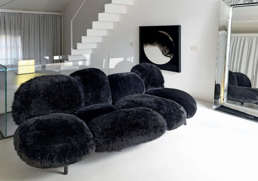 Exuberante e irreverente, o sofá de design dos Irmãos Campana tem o poder de descontrair um ambiente mais sóbrio ou clássico ou de ocupar o foco da decoração, seja qual for o estilo adotado. Com estrutura de aço, o Cipria é composto por 9 almofadas de poliuretano e Gellyfoam e o estofado tem capa removível de pelúcia ecológica. Este sofá de design é uma peça expressiva que não deixa de lado o aspecto funcional.