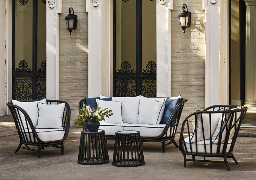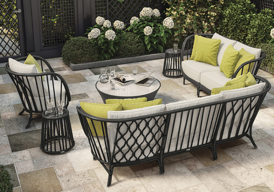 Qualquer área externa, para criar espaços internos e externos que combinam conforto, funcionalidade e estilo sofá Kyoto Alu, disponível em dois ou três lugares. Sua estrutura de alumínio leva a pintura especial da Janus et Cie, que garante beleza e durabilidade. Os detalhes de linhas limpas e formas geométricas são feitos em fibra sintética Janus trançada manualmente, o que resulta em um sofá de área de lazer elegante que pode ser combinado com cadeiras da mesma coleção.